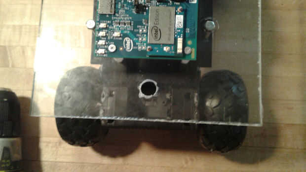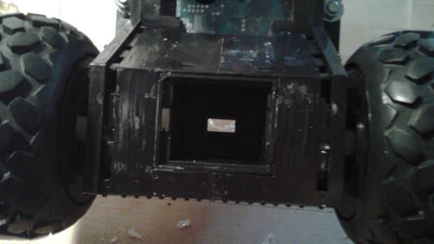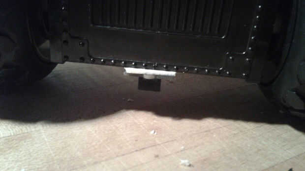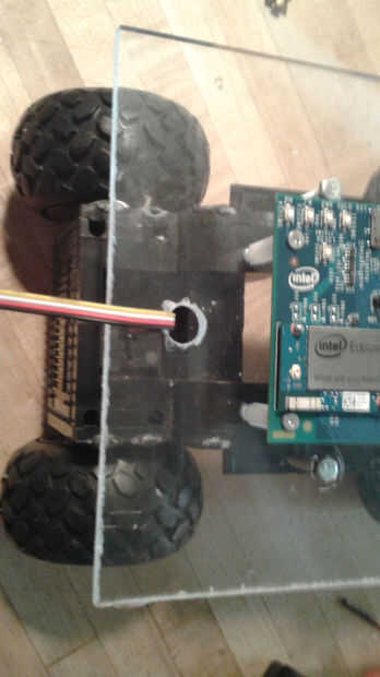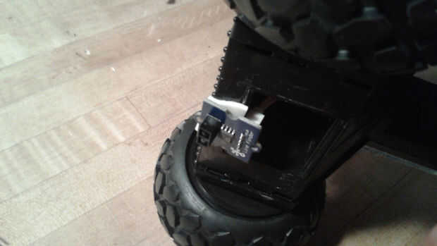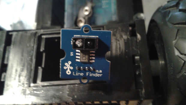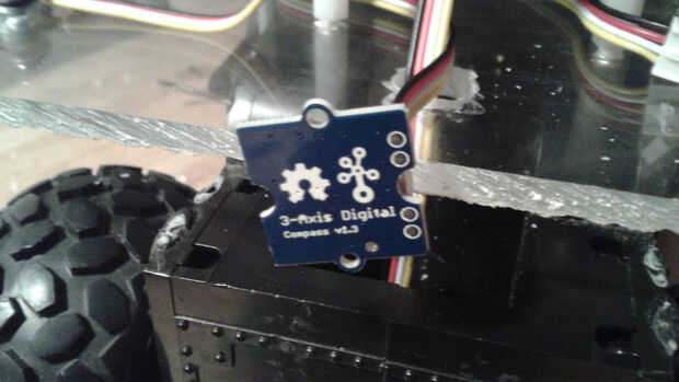 El chasis tenía una zona hueca entre las dos ruedas delanteras donde habían estado el coche RC módulo de sonido y altavoces. Que enrutan el sensor seguidor de línea a través de esta cavidad y había montado en la parte inferior delantera del chasis con cinta de espuma doble cara. Esto se podría ajustar más tarde para afinar la sensibilidad. Me deslizó un módulo brújula digital en el mismo vacío y encamina sus cables por el agujero de la plataforma.