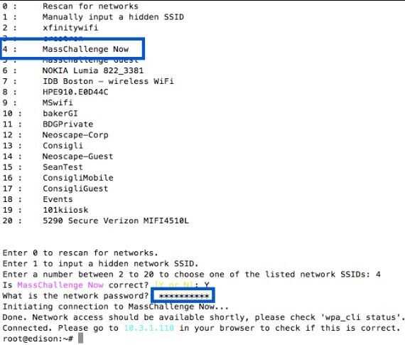 El valor predeterminado de inicio de sesión de Edison es raíz. Una vez que estás en, configurar la red wifi: