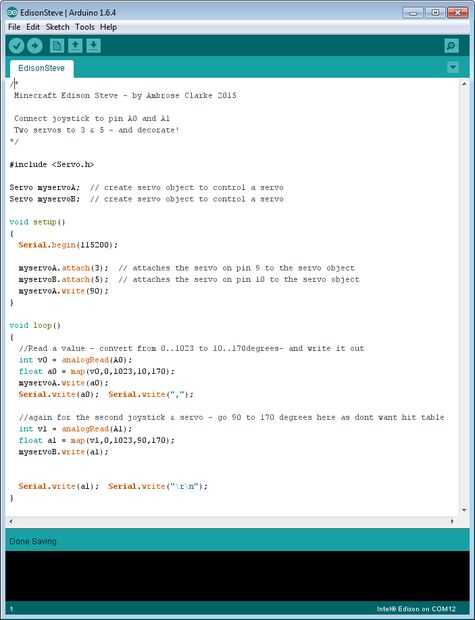 /* Minecraft Edison Steve - by Ambrose Clarke 2015 Connect joystick to pin A0 and A1 Two servos to 3 & 5 - and decorate! */ #include <Servo.h> Servo myservoA; // create servo object to control a servo Servo myservoB; // create servo object to control a servo void setup() { myservoA.attach(3); // attaches the servo on pin 3 to the servo object myservoB.attach(5); // attaches the servo on pin 5 to the servo object myservoA.write(90); } void loop() { //Read a value - convert from 0..1023 to 10..170degrees- and write it out int v0 = analogRead(A0); v0 = map(v0,0,1023,10,170); myservoA.write(v0); //again for the second joystick & servo - go 90 to 170 degrees here as dont want hit table int v1 = analogRead(A1); v1 = map(v1,0,1023,90,170); myservoB.write(v1); }