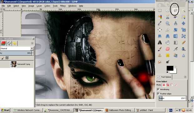 Crear una nueva capa en la foto de ti mismo el abrir la foto de la cyborg en gimp y el uso de la herramienta lazo cortar alrededor de las partes de cyborg de la cara, haga clic derecho sobre la imagen y seleccione Editar, copiar y subir la foto de ti mismo en la nueva capa de pasta. No olvide marcar rebabas en las opciones del cuadro de herramientas.