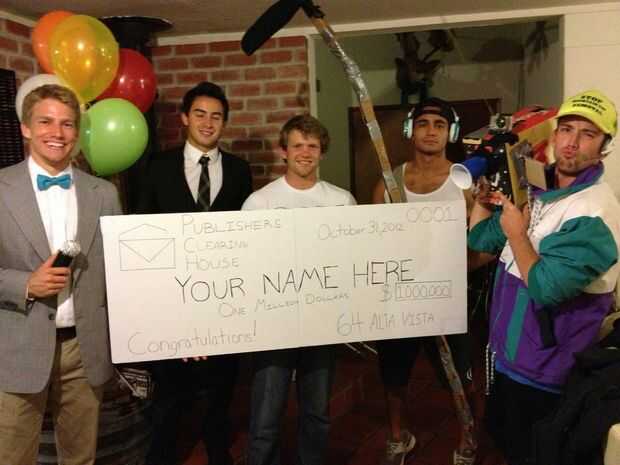 Chico sosteniendo el cheque: lo que quieras. Lo tuvimos que llevar una camiseta diciendo PCH: Premio patrulla pero usted también puede vestir de lujo como nuestro locutor. El cheque es simplemente dos pedazos de tablero de la espuma con cinta juntos serán un poco cartón forro como apoyo. Ver el cuadro para que escriba, o usted puede personalizar el control usted mismo.