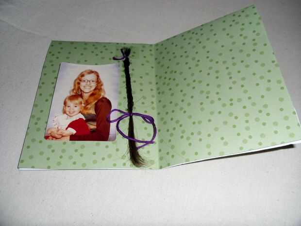 Hice una cuadra con un sobre y un cierre de botón para sostener una tarjeta, una hebra de mi cabello, una imagen de mí mismo y una imagen de la colcha cubierta con papel de contacto. Esto le dará al niño algo que sostenga mientras mamá o Papá Lee un cuento. Mi hermana y yo hemos hecho un par de edredones juntos y cortar pequeños mechones de nuestro pelo y colocaba en la orilla de la colcha que hicimos para los seres queridos. Decidí añadir a mi cabello a la tarjeta de este tiempo.