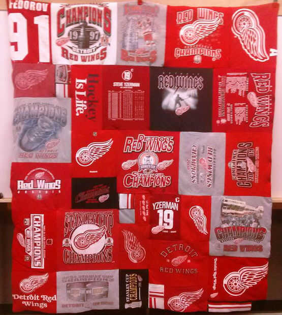 Muchos tienen colecciones de camisetas de viajes, Colegio y experiencias. Hacer una colcha de esas remeras se puede utilizar como una manera de preservar memorias y reciclar camisetas viejas haciendo un artículo funcional y especial. Hice esta colcha de Detroit rojo ala camisetas como regalo de Navidad para un amante del hockey. La colección de camisetas se adquirieron en tiendas de segunda mano como la buena voluntad. Este instructable podría utilizarse para ayudar a preservar recuerdos o hacer un regalo único para la familia y amigos.