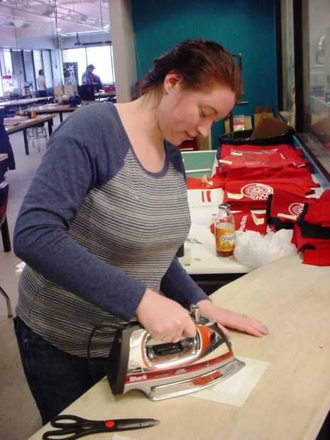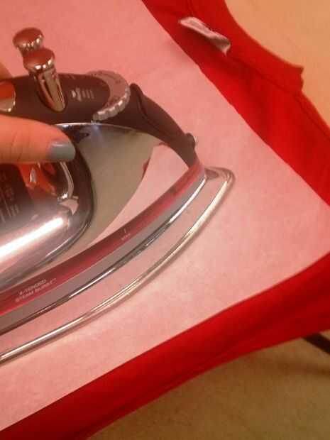 Plancha la camiseta para deshacerse de las arrugas con la parte de diseño hacia abajo. Luego coloque el lado áspero de la entretela hacia abajo en la camisa sobre el diseño y el área que se utilizará en el parche. Plancha la entretela a la tela usando las indicaciones de la conexión.