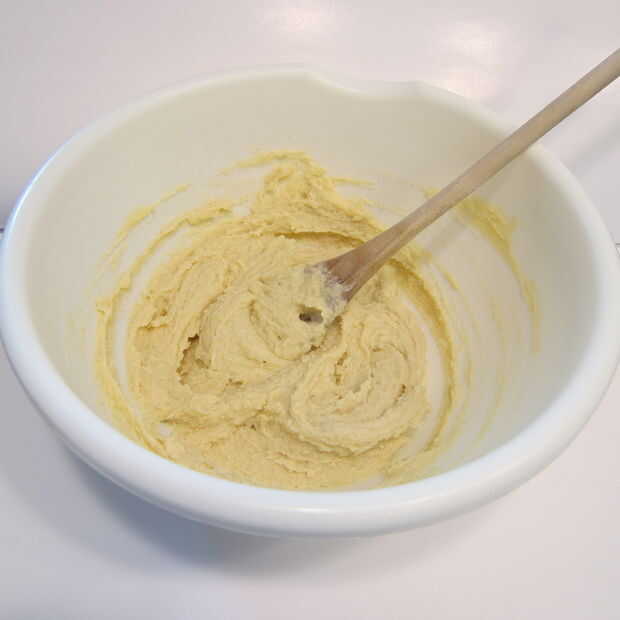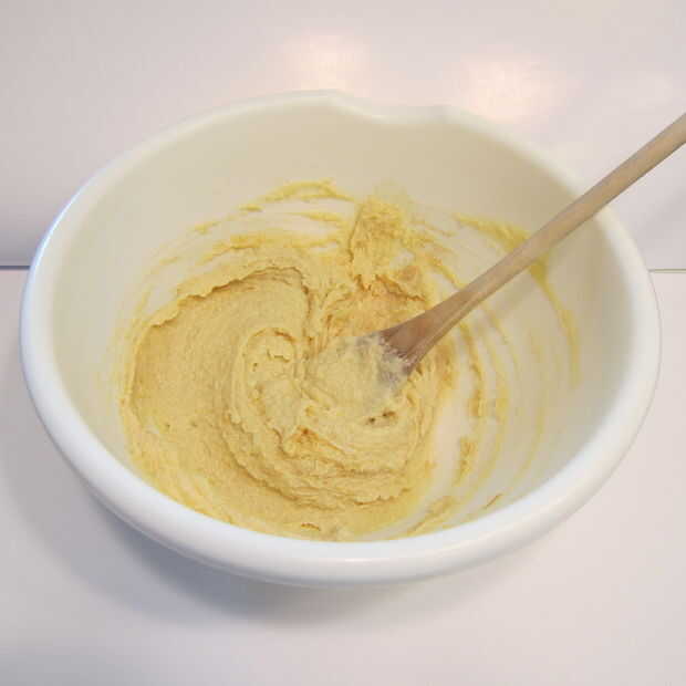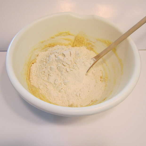 En un gran bol de crema de mantequilla y azúcar hasta combinar. Agregar el huevo y vainilla, mezclando bien. Tamice la harina sobre la mezcla húmeda y antes de revolver, agregar el polvo de hornear. Al empezar a combinar el mojado y en seco los ingredientes, la harina y el polvo de hornear va a incorporar el bien a lo largo de la masa