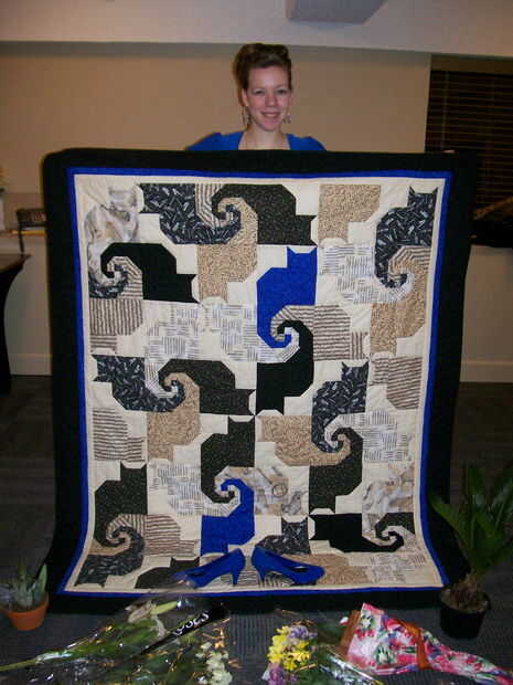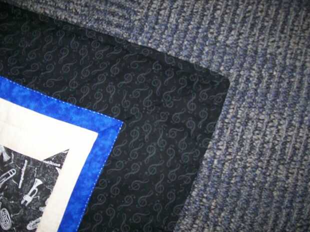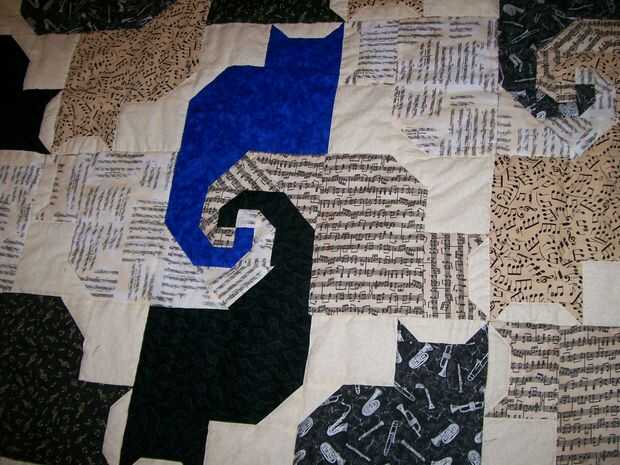 estaba buscando una idea de regalo de recuerdo para mi hija que se estaba preparando para su recital de grad en la música y es un amante del gato loco! Caí en amor con el diseño de este modelo de edredón (Kool Kat Kwilt por Patty Carey, Northcott) y después de mirar a través de mi escondite, se reunieron varias telas con temas musicales que reflejan su pasión y ser conveniente gato colores. Una sola pieza tenía un fondo blanco, así que pasó un tiempo en una olla caliente con un poco de té; una pieza fue brillante y un poco demasiado brillante, por lo que invirtió. La luz marrones, tonos de sepia y los negros se veía bien, pero algo faltaba! Necesitaba un color para añadir algo de interés, y cuando mi hija anunció que llevaba las bombas de gamuza azul en su recital, sabía lo que tenía hacer---dos gatos azules en la mezcla!