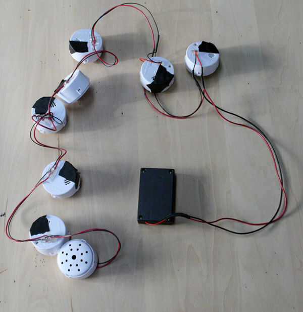 Consulte el diagrama para conectar todos los cables. Deben conectarse en paralelo, por lo que pueden funcionar con otras se enciende. El diagrama tiene 4 botones de sonido en el dibujo, pero es el mismo principio para ocho, todas ellas conectan lo mismo excepto la última.