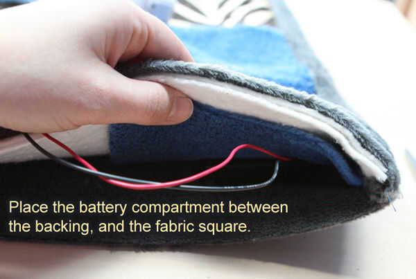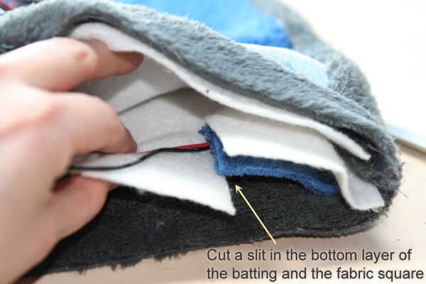 4) corte una raja de lado, aunque un poco de la cuadrados de tela y una capa de bateo. Ejecute el cable a través de esa fisura.