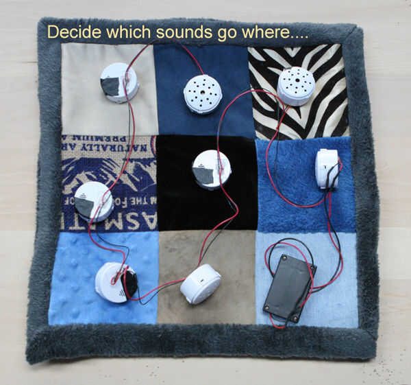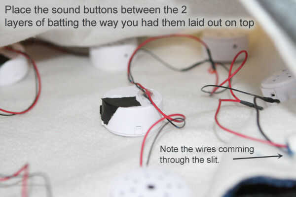 5) diseño el sonido botones entre las 2 capas de bateo, mantenga sus cables se enredo y recuerde usted quiere uno debajo de cada cuadrado.