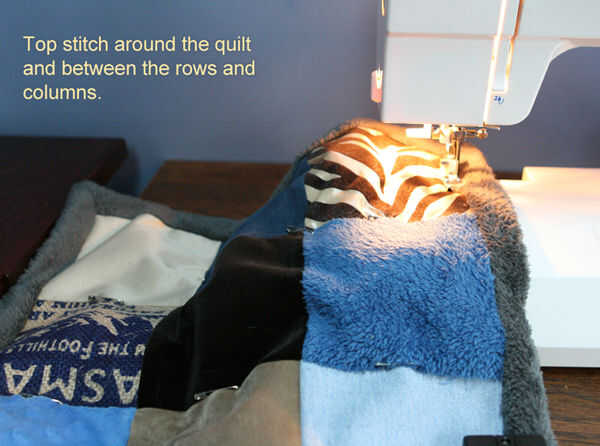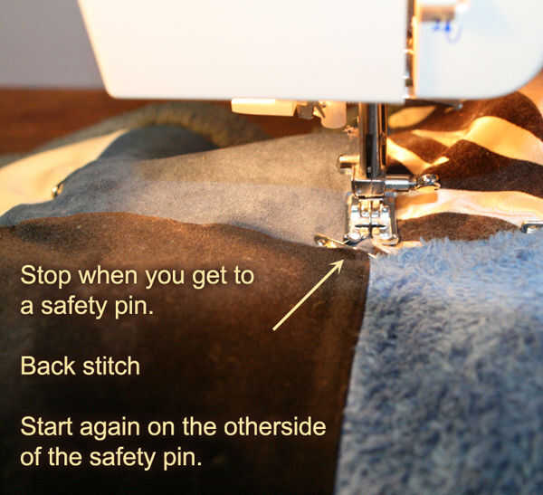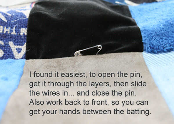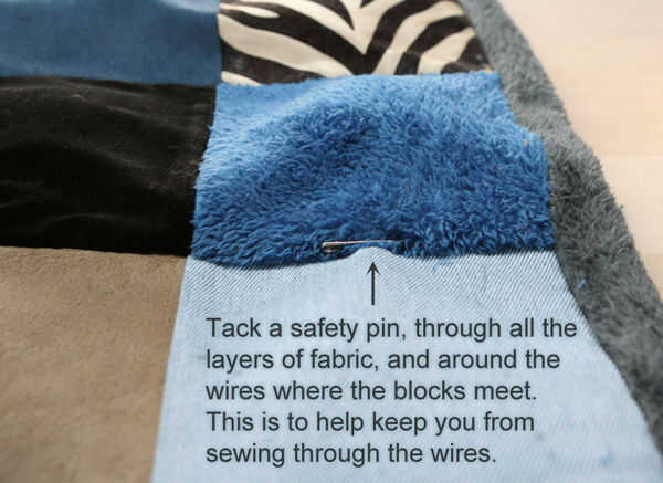 7) puntada alrededor de la colcha y entre todas las filas y columnas. Tenga cuidado de no coser a través de los cables. Encontré que podía sentirlos fácilmente. Cuando se llega a un pin de seguridad... la puntada para un par de pf de puntadas, luego levante la aguja y comenzar a coser otra vez al otro lado del perno. Es una buena idea para coser en ese lado también.
