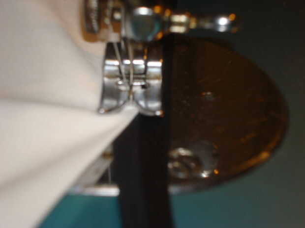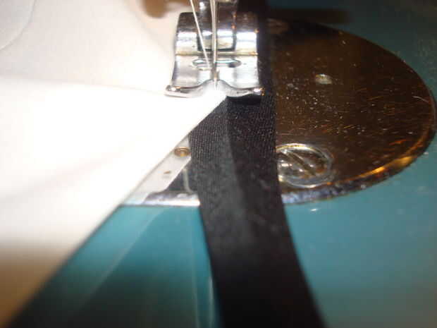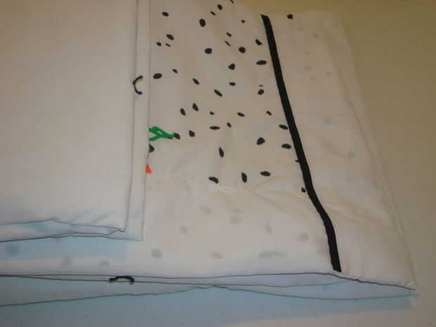 Abrir la cinta hasta la mitad de la cinta será en el lado equivocado de la hoja (parte inferior de la colcha) y el restante de borde doblado de la cinta se extiende más allá de la hoja (parte inferior de la colcha) para formar el borde acabado de la parte superior del edredón (en).