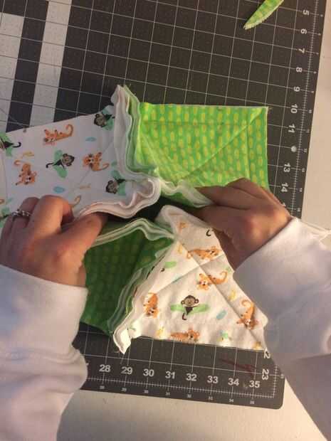 Lugar primera fila borde a borde con la 2ª fila, 1" material que debe ser pelado más adelante se enfrentarán a unos de otros haciendo un"+"en las intersecciones. Como coser a lo largo de la línea de frontera 1", usted pliega plana 1" de material, plegable que la costura se abren en la parte superior e inferior. Repita el procedimiento para coser todas las filas juntas.