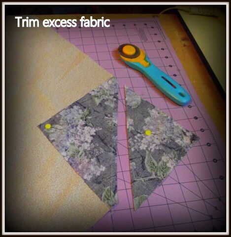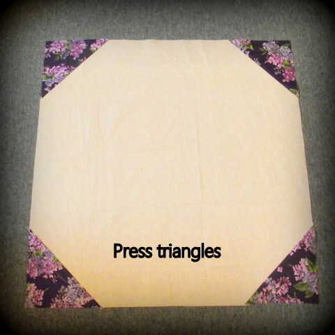 Una vez cosido, ayudarse con unas tijeras y recortar la tela sobrante (ver imagen). Ahora abrir las esquinas del triángulo y plancharlos. Repita para las cuatro esquinas.
