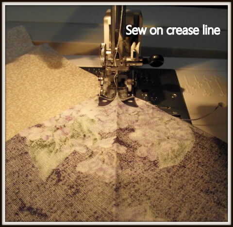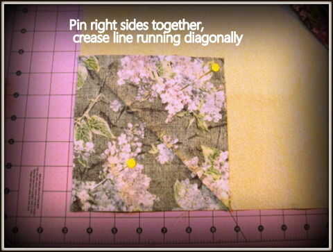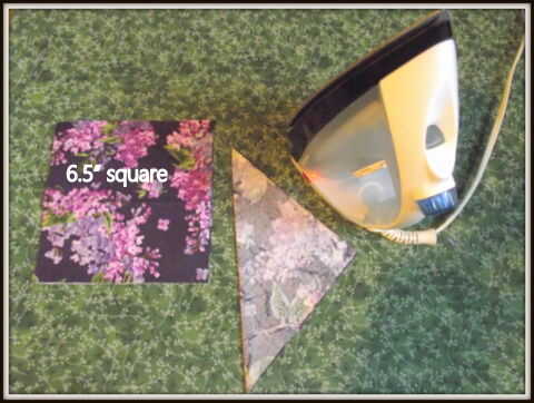 Usar una plancha caliente, junte los cuadrados de 6.5" a la mitad, derecho contra derecho. Al abrir la tela hacia arriba, una línea de pliegue será visible en toda la Plaza.