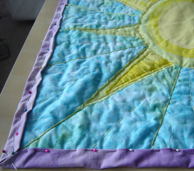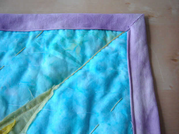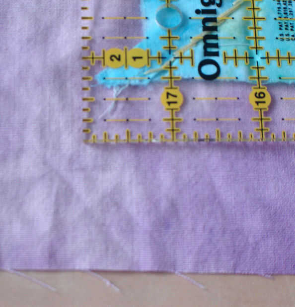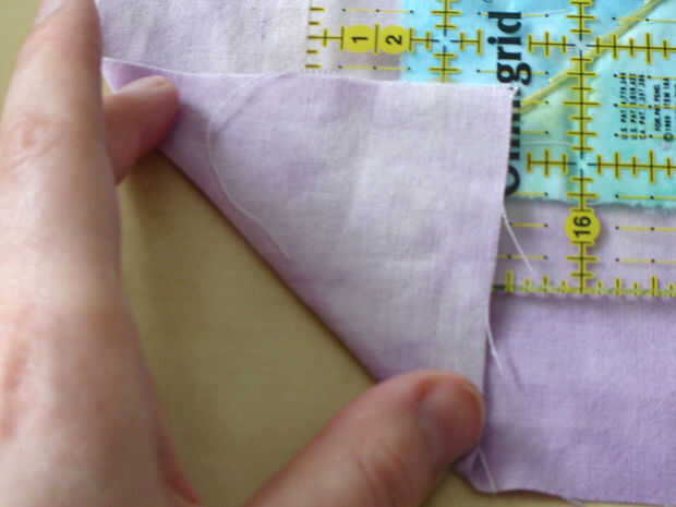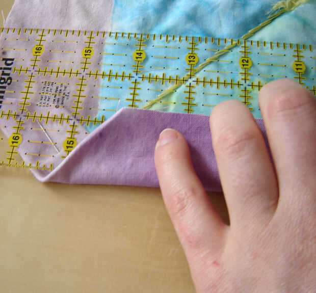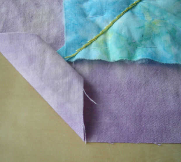 Sostenga una regla de 3/4 de pulgada desde el borde superior y lateral de la tela del frente y doblar la esquina de la base sobre.  Meta la punta del bajo y el pin en su lugar.  Doble el borde inferior y abdomen alrededor de 1/4 de pulgada en el extremo bajo (darle bordes aseados).  Repita con el lado y la tela en lugar del perno. Repita con las otras esquinas y comience a coser.