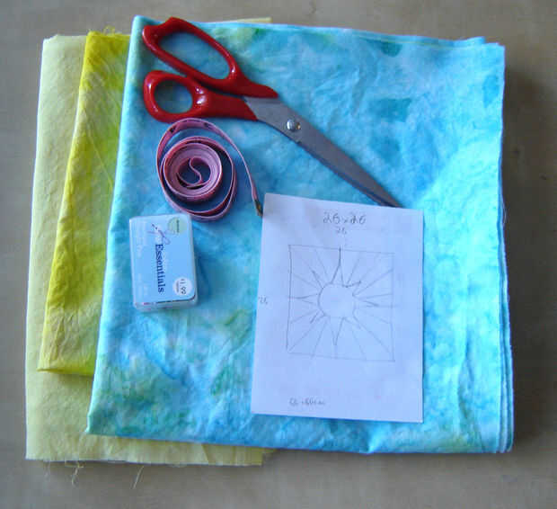 • Tela: utilizar una impresión de batik azulado para el cielo, amarillo para el sol (una porción que vinculo teñido con cúrcuma y un púrpura corbata forro teñido.