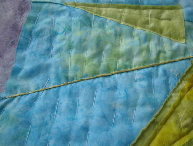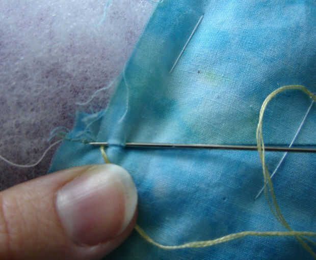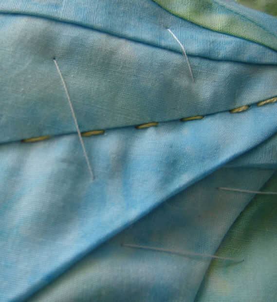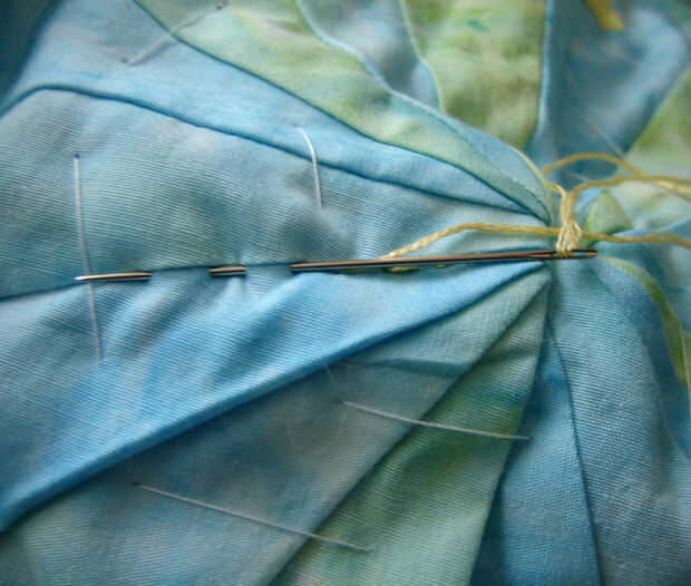Con bordado amarillo cosido a hilo la mano (con una puntada atrás) a lo largo de las costuras hacia afuera del centro de la y entre las costuras utiliza una puntada corriente.