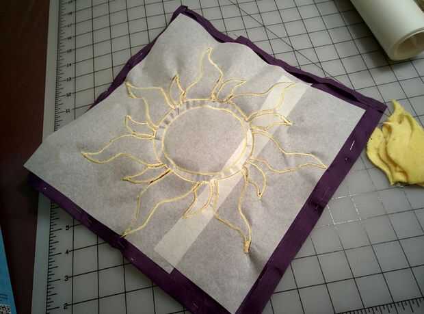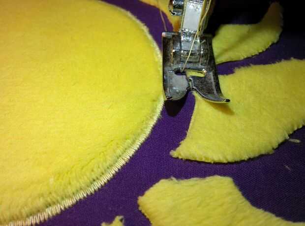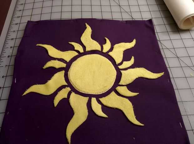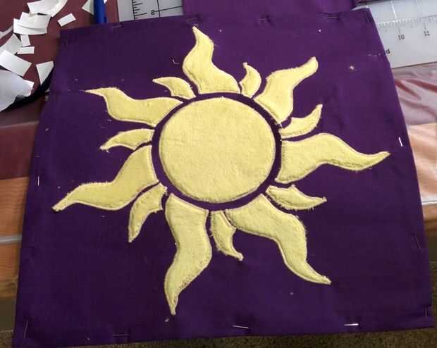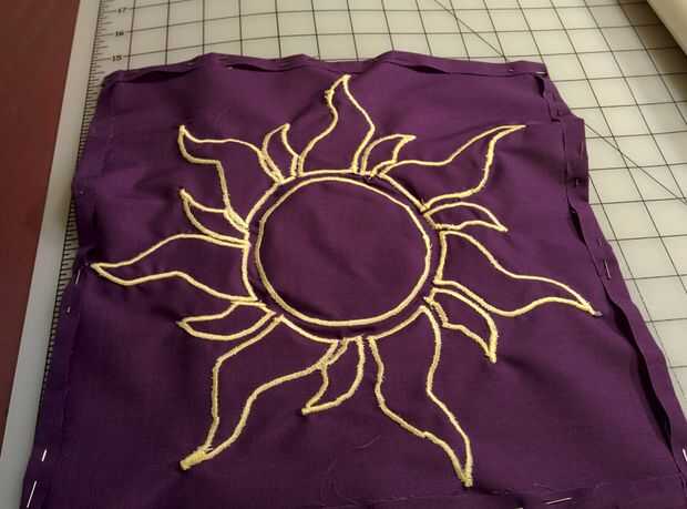 Cosas viene a continuación, hizo lo mismo para todos los rayos poco, asegurándose de colocarlos cuidadosamente en el lugar correcto. Después de coserlos abajo, me arrancó el estabilizador y se quedó con un sol bordado con bordes cuidadosamente.