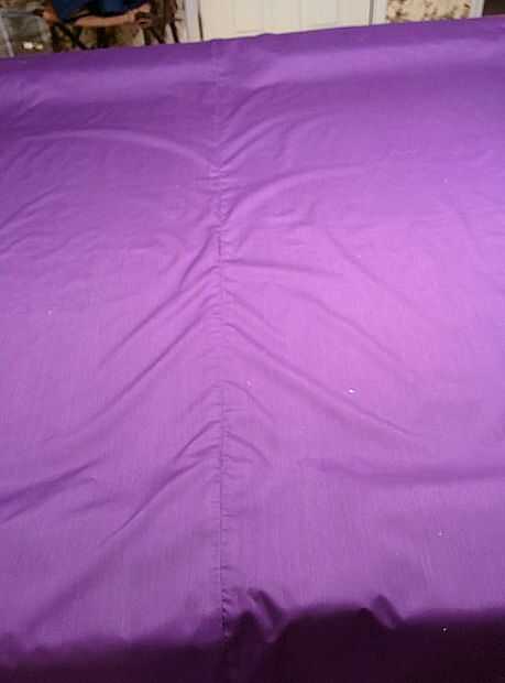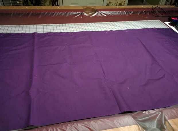 Esta parte era bastante fácil. Me mide dos rectángulos idénticos (60inx30.5in) y (después de cambiar el hilo amarillo con hilo morado y mi máquina de coser en programaciones) cosieron les tenía un cuadrado de tela de color púrpura oscuro de 60inx60in. (La foto final no el mejor, como la tela se coloca sobre una mesa de billar y no se puede ver todo).