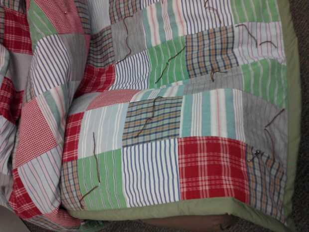 Usando hilo hilado o bordado, unir las capas en el centro de cada otra plaza. Retire los pernos de seguridad. Cortar el hilo a 1".
