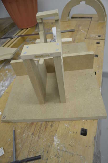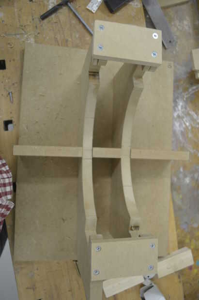 A continuación, se cortaron los soportes de las cuchillas, con motor y caja. Éstos fueron sujetados a una pequeña "columna vertebral" montar una placa base mdf grueso usando una Cruz conjunta reducir.