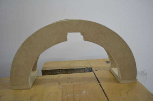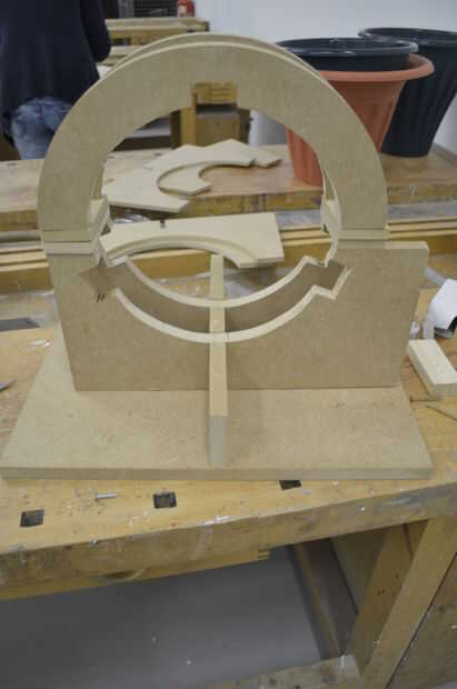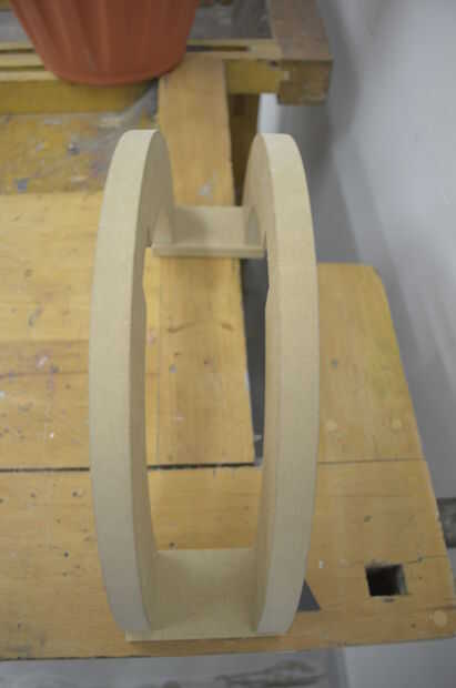 Los soportes para la maceta fueron cortados de mdf grueso de 10mm. La forma circular fue cortar utilizando una sierra de cinta y luego lijar hasta lograr un acabado liso.