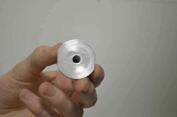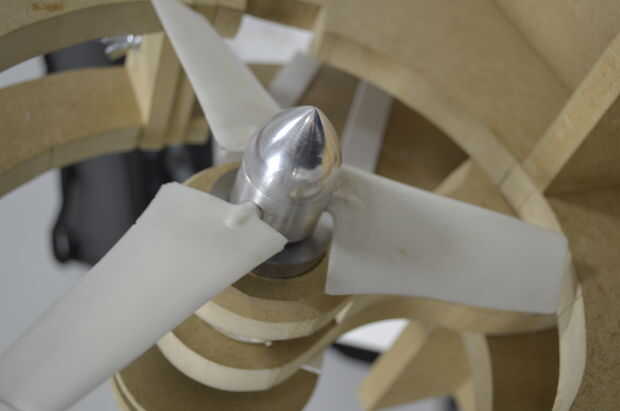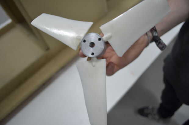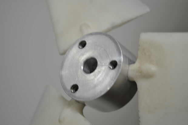 A continuación, un centro fue también trabajado a máquina de aluminio. 3 grub tornillos fueron colocados 120 grados aparte y perpendicular a los agujeros de 8mm para las cuchillas. en este punto, algunos 3mm acero barras wre insertado en la conexión del cubo del aspa con el fin de reforzar las hojas.