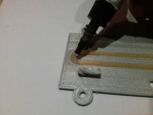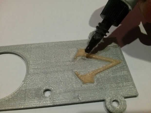 Coloque la tapa ahora preparada sobre la base, primero alinee las "cerraduras" en sus agujeros, hacer uno primero y luego el otro, puede usar el cuchillo para ayudar a tirar en su lugar. Luego ponga los 2 tornillos de M3x14mm en los 2 agujeros cerca de la insignia y que encajen firmemente.