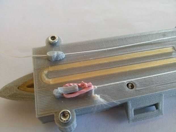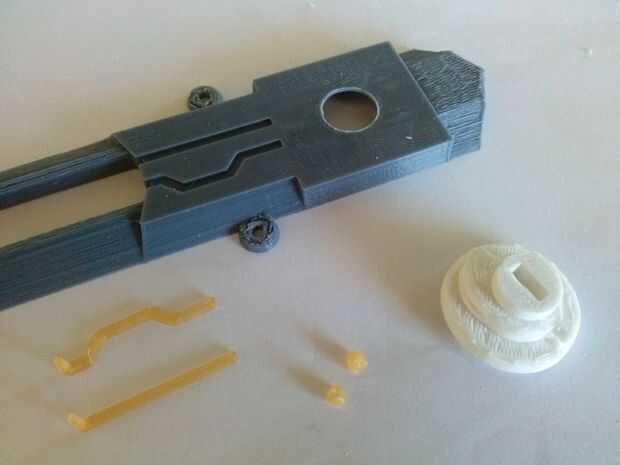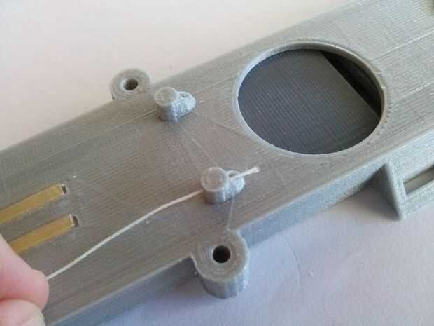 No entraré en detalles aquí, porque esto es sólo un extra, el foco principal de diseño en un mecanismo de activación del regulador, es sobre todo para los más rebeldes, como yo. Necesitarás un trozo de alambre de nylon fuerte, pero fino, unos 25cm de largo, también necesitarás una banda elástica adicional más pequeña. Una aguja podría ser útil también para ayudar a pasar el alambre por los agujeros. Primero imprimir las partes extras y prepararlos como antes. Luego pasar el alambre por los agujeros, como en las fotos arriba, no olvide incluir las pequeñas esferas de oro, atar hasta el alambre y pegar así. Conecte un extremo del alambre a una goma y fije abajo en el gancho plástico de la cubierta de la primera. El otro extremo es que se tire del cable. Hacer unas pruebas, lijado cuando sea necesario y finalmente se llega a esto. Vea el video!