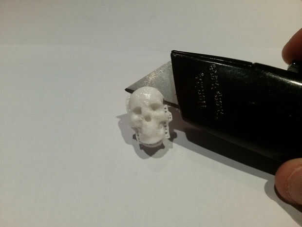 Lo más evidente después de la impresión es exactamente eso. Algunas de las piezas tendrá que ser impreso con el material de apoyo, así que aquí que tendrás que pasar algún tiempo cuidadosamente sacándola. Yo suelo utilizar un bisturí o un cuchillo y cuando las cosas se ponen difíciles, unas pinzas pequeñas. Tenga cuidado de no lastimarse o dañar la pieza. Las piezas que vas a tener que sacar material extra son los "deslizadores", el "activador pin base" y el "cráneo". La "base" puede tener también algún material de apoyo debido a tender un puente sobre la abertura de la hoja. Eventualmente podría haber otras, dependiendo de cómo podrá imprimirlas. Si tienes dudas sobre los nombres de cada parte, por favor cheque correctamente se nombran los objetos descargados, todas las partes y número de allí.