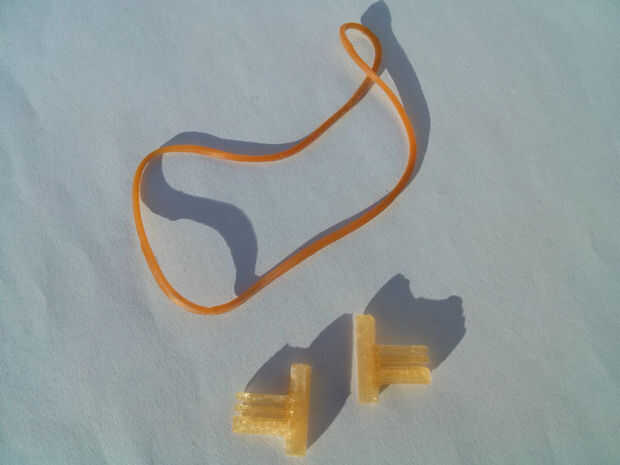 Los cortes del "encaje" en realidad son para la banda de goma. Así que elige uno y se la goma dentro de las diapositivas. Ahora antes de hacer otra, pagar atención, las cerraduras se pretenden usar en una posición específica, tienen 3 bits, 2 cortes, uno de los bits es más grande que los otros 2, que parte está destinada a ser en la parte superior. De lo contrario no funcionará. La goma también no debe tener ninguna vueltas cuando consigue fija en la otra cerradura, así que hacerlo con cuidado. El mismo lado del elástico que se coloca cerca de la broca grande en una cerradura, debe ser la misma para conseguir al lado de la broca grande en la otra cerradura. No gire la banda de goma. Ahora que están montadas las cerraduras y la banda de goma, es hora de poner en la "base". La base tiene 2 agujeros para las cerraduras, uno de ellos poner en allí y recuerda, poco más grande al revés y luego deslice la banda elástica hacia una vía lateral que está ahí sólo para él. Tiene una inclinación pequeña dentro para evitar que la banda de goma para saltar desde allí. Montar la otra cerradura en el otro orificio, una vez más, poco más grande al revés. Ahora prueba si gira usando el dedo. Si no gira fácilmente, el elástico es demasiado fuerte o los orificios son ajustados para ellos. Si es el último, quitar los "candados" y ensanchar los orificios con un cuchillo o incluso un destornillador.