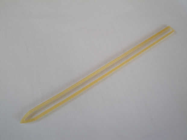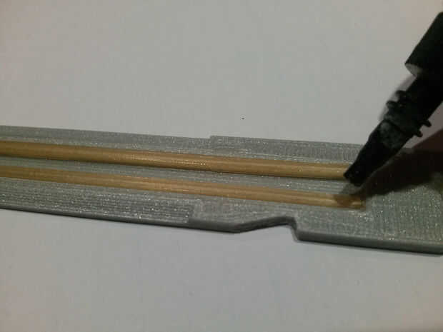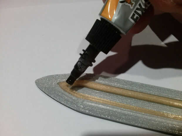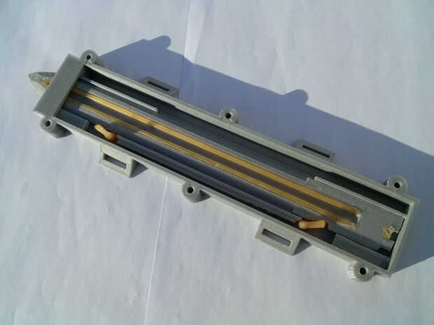 Primero deberías probar si las "rayas de la hoja" entra dentro de la "hoja" donde se supone que son. Si no es así, entonces puede que necesite lijar o incluso cortar unos milímetros en la parte posterior. Recuerde que las rayas deben ser recta, no curva dentro de, de lo contrario la hoja no resbalará. Se utilizará ese espacio entre las rayas por otra pieza dentro de la base. Cuando esté satisfecho con el resultado, pegue todo en su lugar. Deje que se seque.