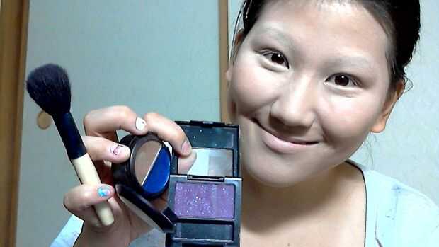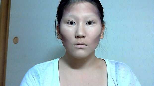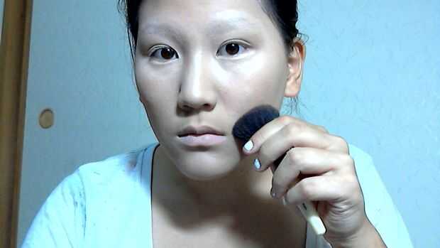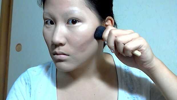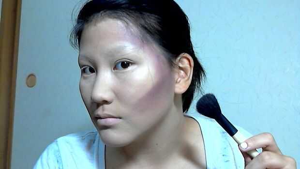 Contorno de los lados de su cara con la mezcla de púrpura/marrón mate de sus templos a los lados de su frente.