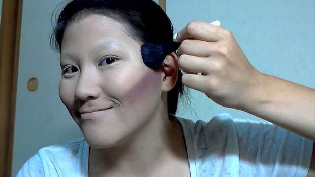 Seguir adelante y trazar una línea desde el borde de sus labios hacia su oído y mezcla la línea púrpura/marrón para perfilar sus mejillas.