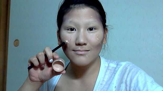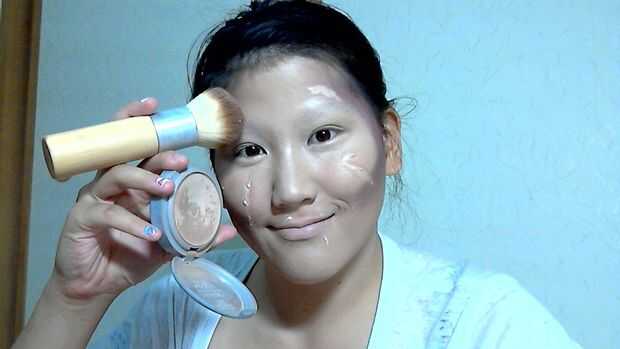 Usar el dedo para mezclar el corrector en tus cicatrices y luego usar el polvo de la Fundación para establecer.