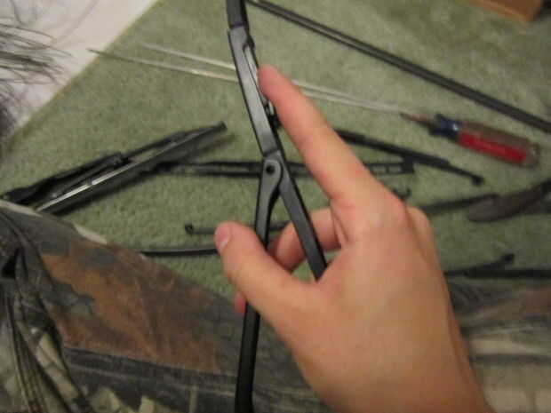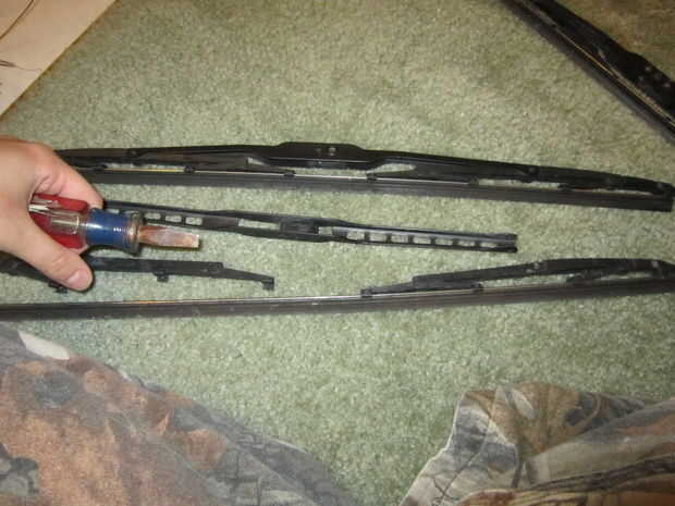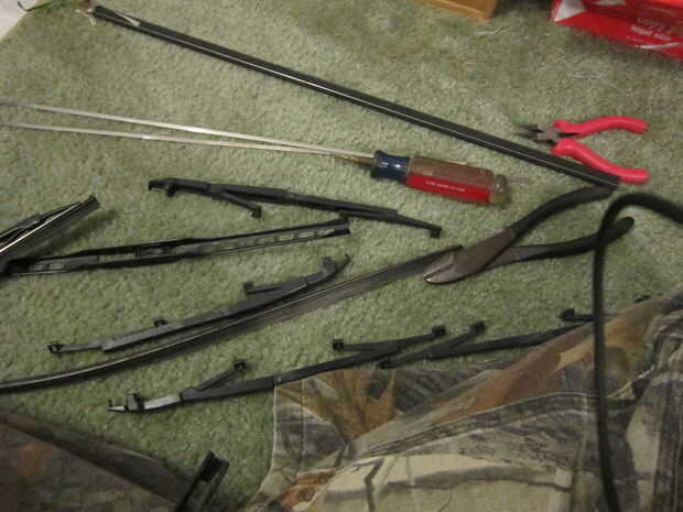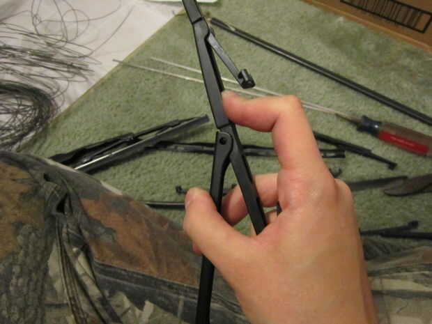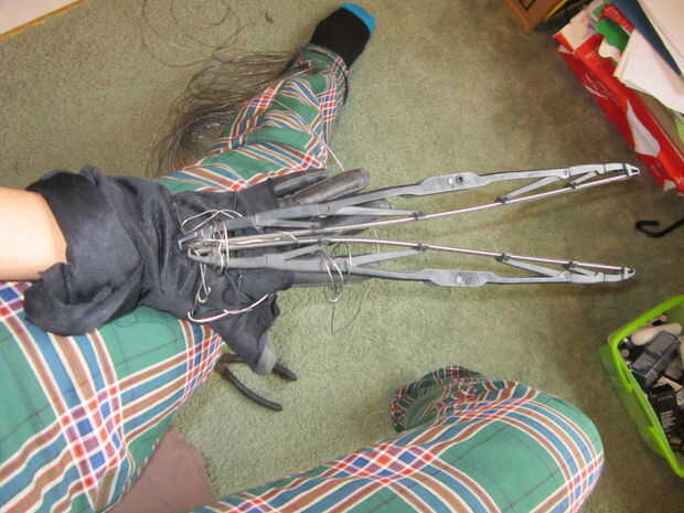 Al principio pensé tablero de la espuma es un material aceptable para crear el Manostijeras, pero estaba en absoluto motivado para comprar el tablero de la espuma. Después de una búsqueda en Google de pantalla tomas de la película, pensé en un material estaba más cómoda haciendo el Manostijeras fuera - limpiadores de parabrisas. Creo que limpiaparabrisas son una buena longitud (se ven sólo un poco más cortos que el Manostijeras en la película) además tienen ningunos filos. Limpiar los limpiaparabrisas con scrubbing bubbles, como que había adquirido limpiaparabrisas usado gratis. Quité los pequeños brazos de fibra de vidrio del brazo metálico y conectarse juntas esos conjuntos de la misma manera como el grupo más grande. Utilicé una pintura en aerosol gris imprimación antioxidante en los limpiadores de parabrisas. Para conectar los limpiaparabrisas a mis guantes de cuero hice una manga del revestimiento de un viejo par de pantalones cortos atléticos y utiliza una puntada de zig-zag. Asegurar el limpiaparabrisas en la manga para el guante utiliza (supongo) cable de calibre 18. Tenía mucho que trabajar con y trató de diferentes diseños. También usé hilo de tapicería de nylon y cinta aisladora para asegurar mi "tijeras" en la manga que cubre mis guantes. Me libre de manos la forma de los mangos de tijeras, cortar las tijera-asas de cartón, pintado negro y utiliza cinta aislante para sujetar a mi "Manostijeras".