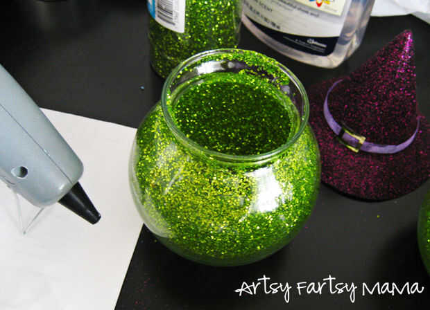 Añadir una línea de pegamento caliente alrededor del borde superior del vidrio y luego colocar el sombrero de la bruja brillante en la parte superior.