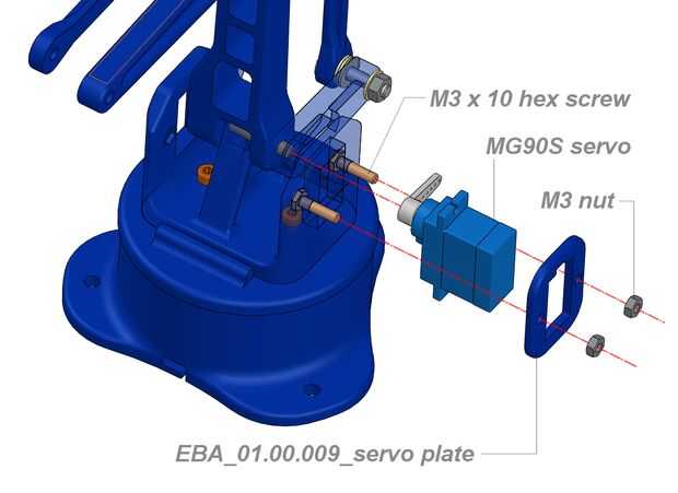 Introducir el servo en el asiento cuadrado en ángulo en la placa base y deslice el cuerno en la cubierta en forma de brazo que impulsa el movimiento vertical. FixT la placa de prensa contra el servo utilizando dos tuercas M3