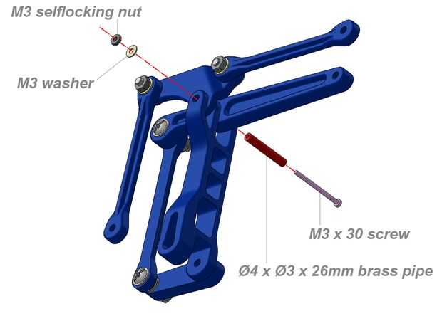 La batea en posición horizontal brazo (005) y enlace triangular (006) alineación con la conexión superior del brazo de accionamiento hacia delante (004). Introduzca el tubo de latón de Ø4 mm cruzando todas las partes y fijar con el tornillo M3x30, bloqueado por la tuerca en el otro lado.