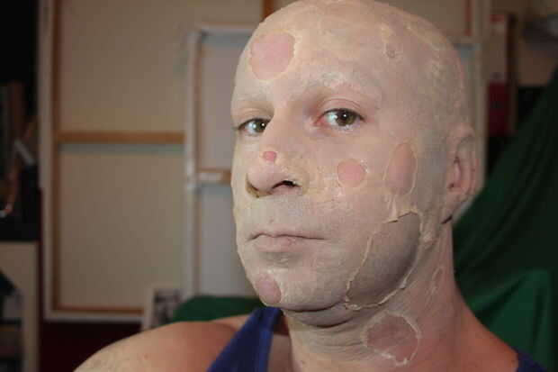 Aplicar color de piel muerta 'Krylon contusión rueda' (el círculo uno en la imagen con la máscara en él) al área sin agujeros para mezclar.