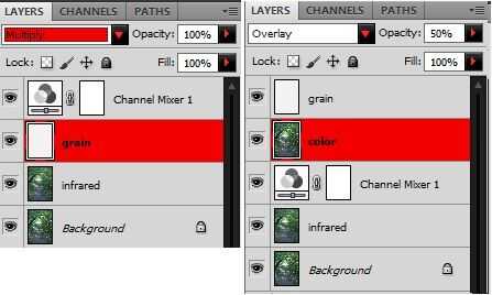 Para obtener los colores a la imagen, empiece nuevamente duplicando la capa de fondo arrastrando ahora entre el mezclador de canales y la capa del grano. Se nombre a esta capa "color".