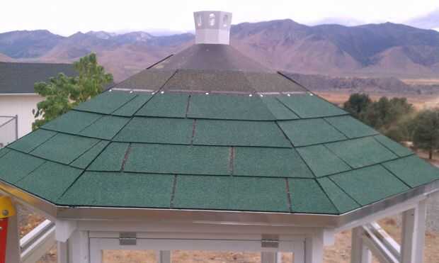 Si se construye esta estructura, 2 paquetes de tejas de 3 lenguas de asfalto son bastantes, especialmente si usted planea sus cortes con piezas más pequeñas como los cursos de tejas más estrechos. He utilizado asfalto sentía como contrapiso. Utilizado sobre 38 pies del rollo, así que si usted puede conseguir un rodillo parcial, hacerlo o tienes un montón de sobras. Se refieren a un sitio que proporciona instrucción en techos si nunca lo has hecho antes. Yo no documentan este paso, porque es muy tedioso. Si usted tiene un ayudante para hacer cortes para usted, puede permanecer en la escalera y continúe haciendo clavados. El techo me llevó todo el día hasta el final, porque cada teja debe ser cortado, incluyendo las lengüetas de la hilera inicial de corte. Estos cortes vinieron en prácticos para usar como tapas de cumbrera en el ocho crestas formadas.
