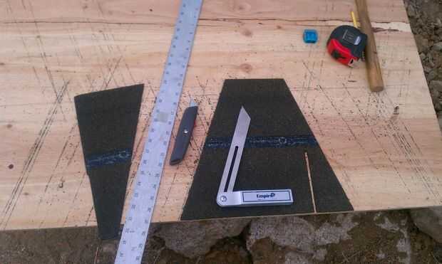 Los ocho paneles que corté fueron trapezoide en forma como en la foto de la ripia del asfalto por encima en la segunda foto. Hubo ligeras variaciones en dimensiones por lo que cada uno fue medido y cortado individualmente. Una vez enroscado en su lugar instalé un borde de goteo intermitente para cubrir el contrachapado y tapas de los extremos de la viga.
