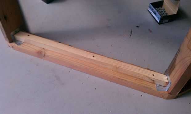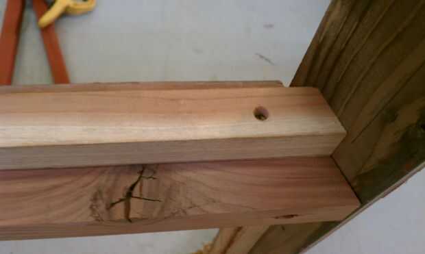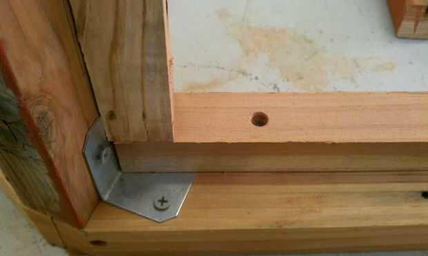Las calas para el alféizar de la ventana, base y pared son 26" de ancho x 1 3/8" x 1 3/8". Había planeado la pintura de todos los 2 "x 2" cubierta riel husos que dio una dimensión acabada de 1 3/8 "x 1 3/8". Ellos son retroceder 1" desde el borde de los umbrales para las tiras de cierre horizontal para el policarbonato y la profundidad de los paneles. Usé una pequeña escuadra de carpintero para colocar líneas de lápiz para la ubicación de las calas. Una vez más, los bordes fueron inglete a 22,5 grados.