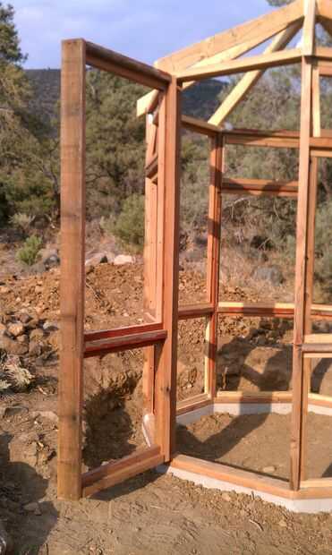 En este punto, necesitaba una puerta. Empecé quitando los lazos de cuatro postes en la primera foto. Había medida del hueco y me resta 1/4" del alto y ancho. Los extremos de la solera y extremos del travesaño se inglete a 22,5 grados. La longitud era hueco de menos de 1/4" menos el espesor de dos 2 x 4. Medido para la ubicación de la solera para que coincida con las paredes circundantes y ser visualmente en el plano. Recortado la apertura de la ventana y la apertura de panel inferior con el mismo ajuste en las paredes. Todavía el necesario para acomodar los paneles de policarbonato transparente y paneles de pared inferior.