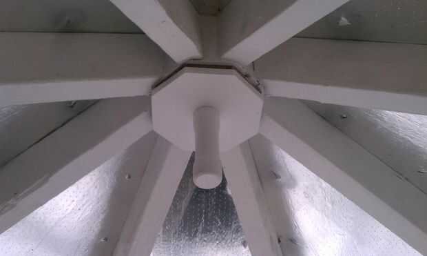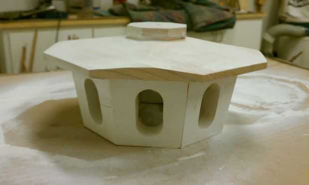 La parte superior fue creada por pegar a un panel de 9 "x 9" de 2 x 4. He hecho un poco más grande por lo que pude extraer limpio cuando el pegamento se seca y cortada a las dimensiones finales. Una vez hecho esto, corte las esquinas a 45 grados. Entonces hice una plantilla de sujeción para guiar el panel a través de la Sierra de mesa sobre el borde, similar a la idea de una plantilla de espigado. Establecer la hoja de Sierra de mesa 10 grados y la máxima altura y hace ocho pases a través de la hoja, uno para cada borde. Para separar las piezas dejadas intactas de los cortes de 10 grados, ajuste altura de la cuchilla de Sierra de mesa a 1/2" y la valla 7" de la hoja. Hice ocho pases con el panel en su cara para soltar la izquierda pedazos de las pasadas verticales para crear la pequeña porción de sombrero sobre el techo de la cúpula como se ve en la primera foto.