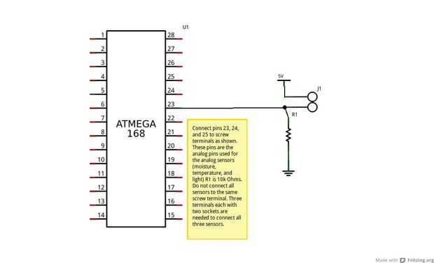 Foto 1 (sensor analógico) Conecte los pines 23, 24 y 25 a terminales como se muestra. Estos pines son las patillas análogas utilizadas para los sensores (humedad, temperatura y luz). R1 es 10 k ohmios. No conecte los sensores al mismo terminal de tornillo. Se necesitan tres terminales con dos zócalos para conectar todos los sensores de tres.