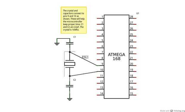 Imagen 2 (cristal / tiempos) El cristal y los condensadores conectan a los pines 9 y 10 como se muestra. Estas ayudarán a microcontrolador tenga tiempo. C1 y C2 son 22pF. El cristal es de 16Mhz.
