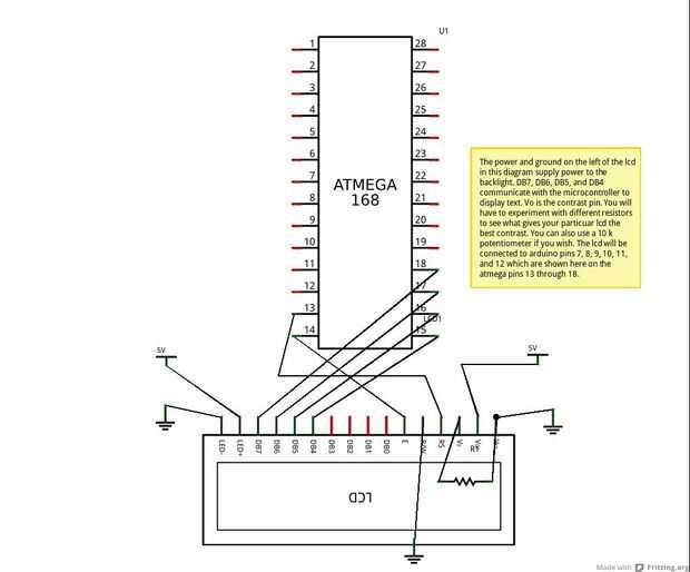 Imagen 3 (pines del LCD) Alimentación y tierra a la izquierda de la pantalla LCD en este diagrama de corriente a la luz de fondo. DB7, DB5, DB6 y DB4 comunican con el microcontrolador para mostrar texto. VO es el pin de contraste. Usted tendrá que experimentar con diferentes resistencias a ver que da su LCD el contraste mejor. También puede utilizar un potenciómetro 10 de k si lo desea. La pantalla LCD se conectarán a los pines de arduino , 7, 8, 9, 10, 11 y 12 que se muestran aquí en los pins del atmega 13 a 18 años.