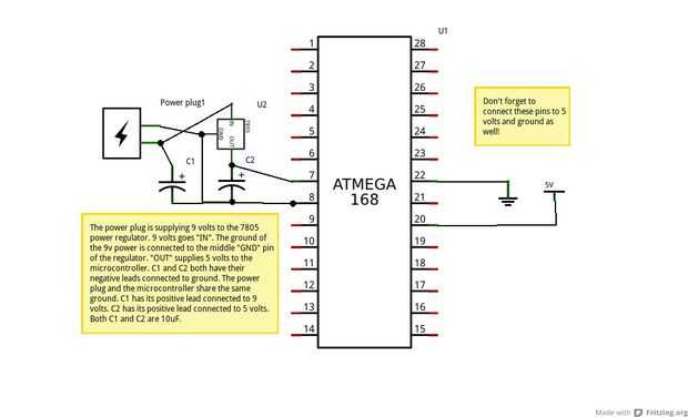 Cuadro 4 (regulación de la energía) El enchufe de alimentación es el suministro de 9 voltios para el 7805 regulador de potencia. 9 voltios va "IN". La tierra de la clavija de alimentación 9 voltios va al pin "GND" medio del regulador. "OUT" suministra 5 voltios al microcontrolador. C1 y C2 tienen sus terminales negativo conectados a tierra. El enchufe de alimentación y un microcontrolador comparten el mismo suelo. C1 tiene su positivo conectado a 9 voltios. C2 tiene su positivo conectado a 5 voltios. C1 y C2 son 10uF.